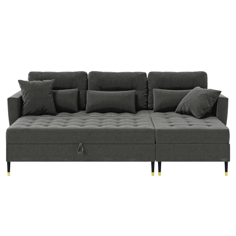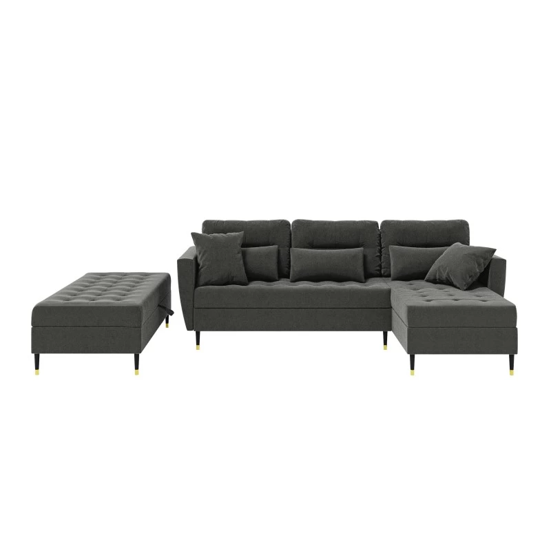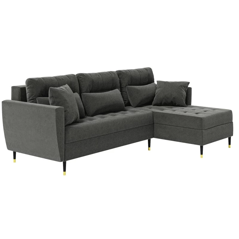 Le canapé d’angle HONORE se démarque par ses détails capitonnés, son banc coffre et ses nombreux coussins. Ses détails dorés viendront le sublimer et apporter une touche très élégante à votre intérieur. Déplacez le banc afin de créer un couchage 140 x 200 cm. Ouvrez-le et découvrez un coffre qui vous permettra de ranger plaids et oreillers.