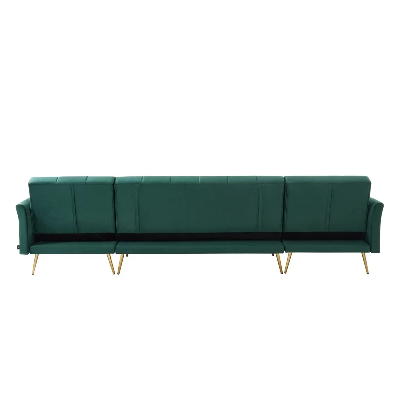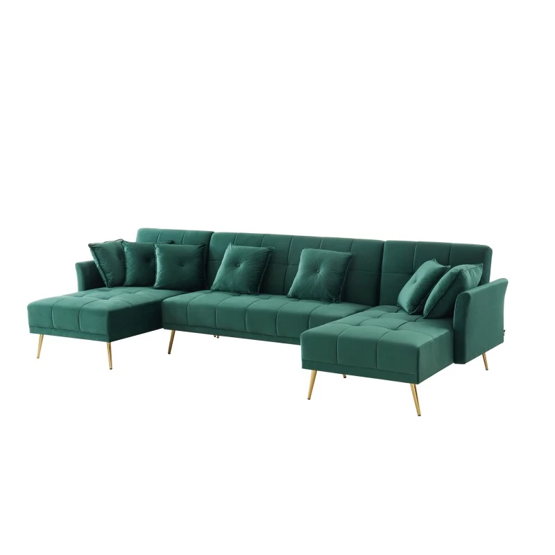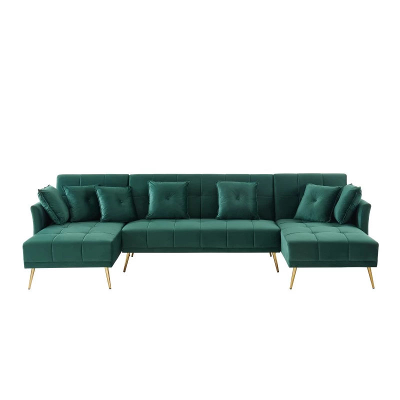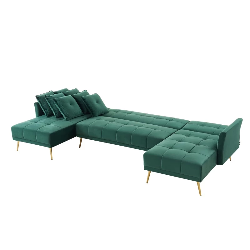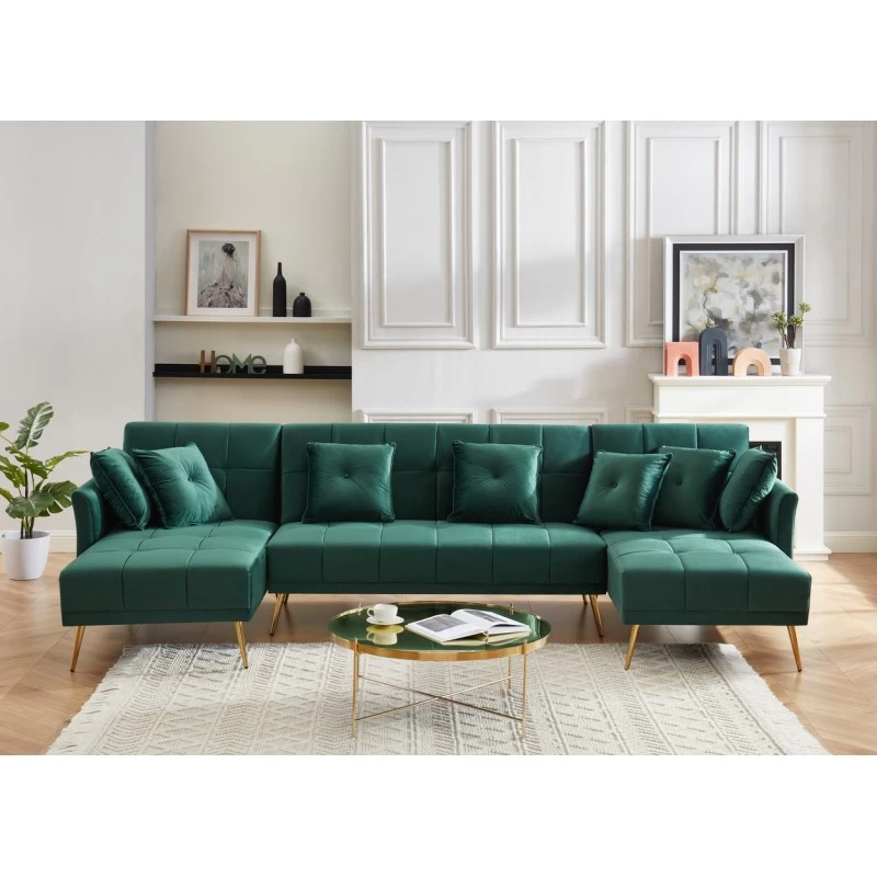 Pour un intérieur chic et élégant craquez pour le canapé panoramique AROMA 6 places ! Laissez vous séduire par ses détails capitonnés, ses pieds dorés et son velours.
