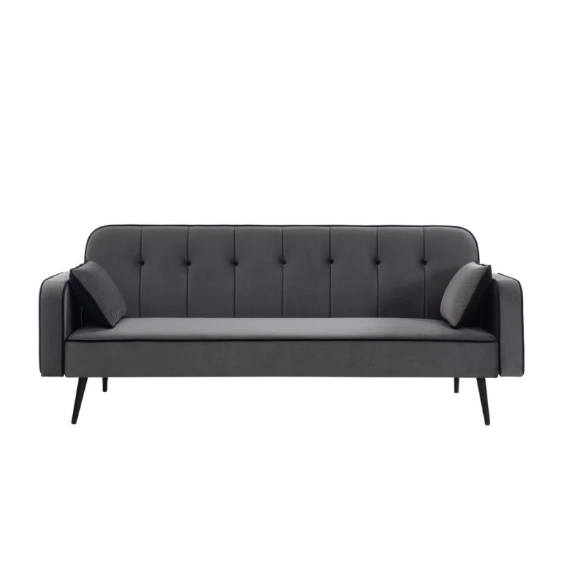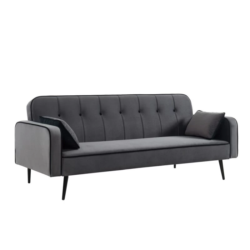 Canapé Convertible SWEETY Droit En Velours Gris Pieds Métal Noir Et 2 Coussins