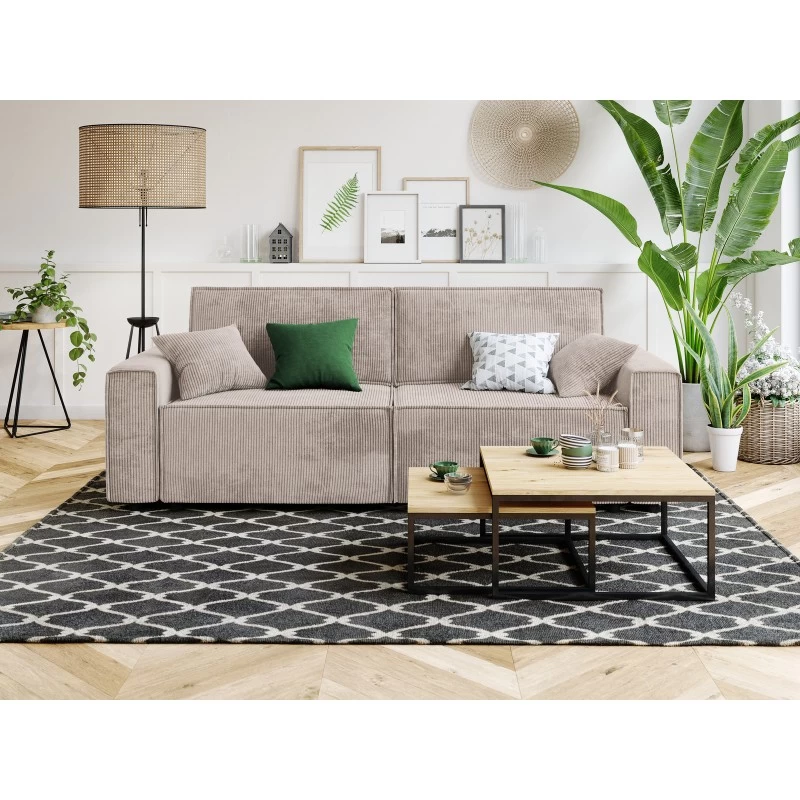 Son revêtement en velours côtelé, ses accoudoirs carrés et son format généreux sont ses vrais atouts tendance.
