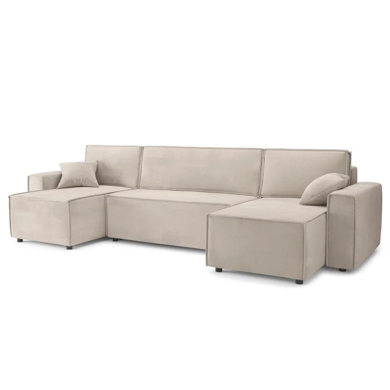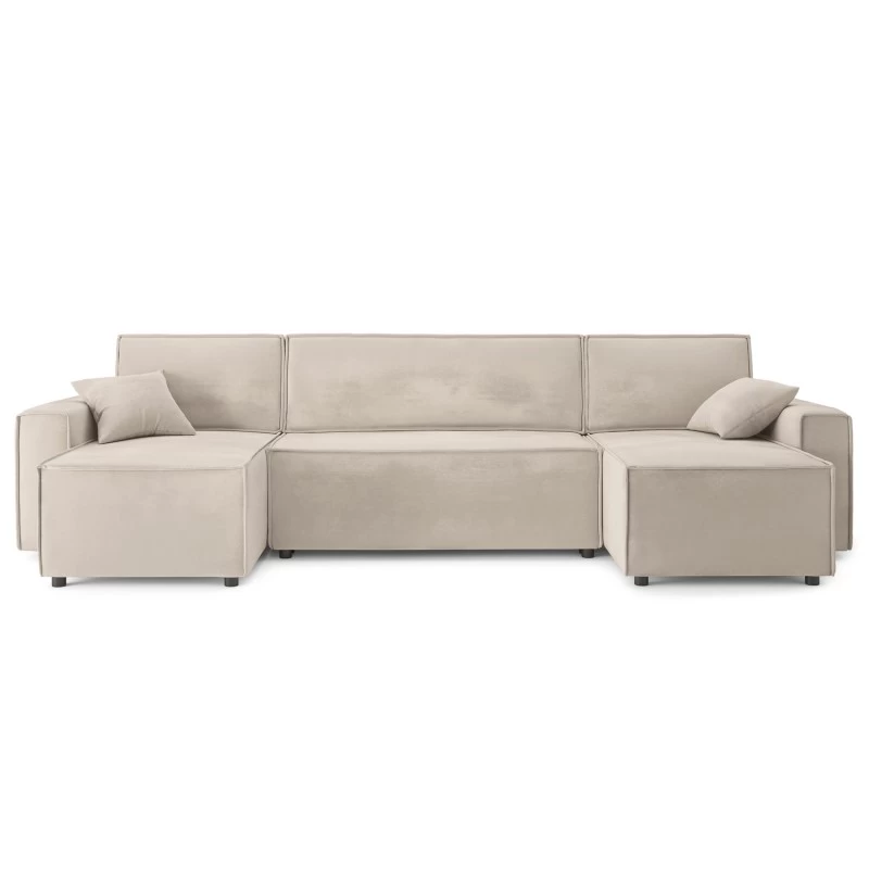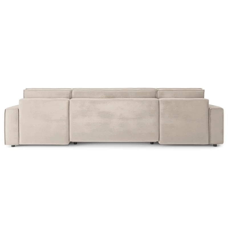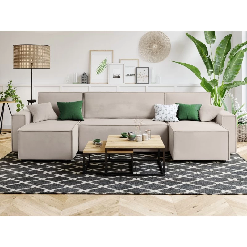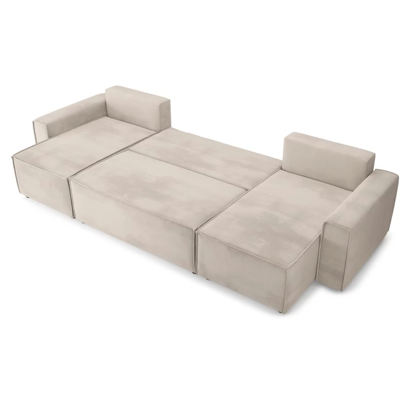 Son revêtement en velours grège, ses accoudoirs carrés et son format généreux sont ses vrais atouts tendance.