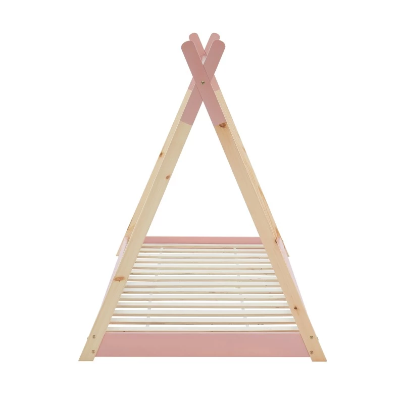 Lit enfant rose TINY en forme de tipi 90x190cm – Structure en bois massif de pin – Sommier inclus – Dimensions : L197xP106,5xH136,5cm