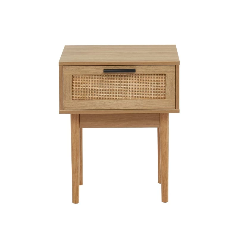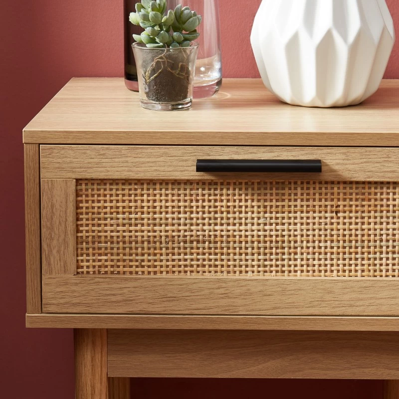 La table de chevet AMANA vogue sur la tendance du moment avec son habillage en cannage naturel. Élégante et pleine de caractère, elle amène un esprit vintage et cocooning à votre chambre.